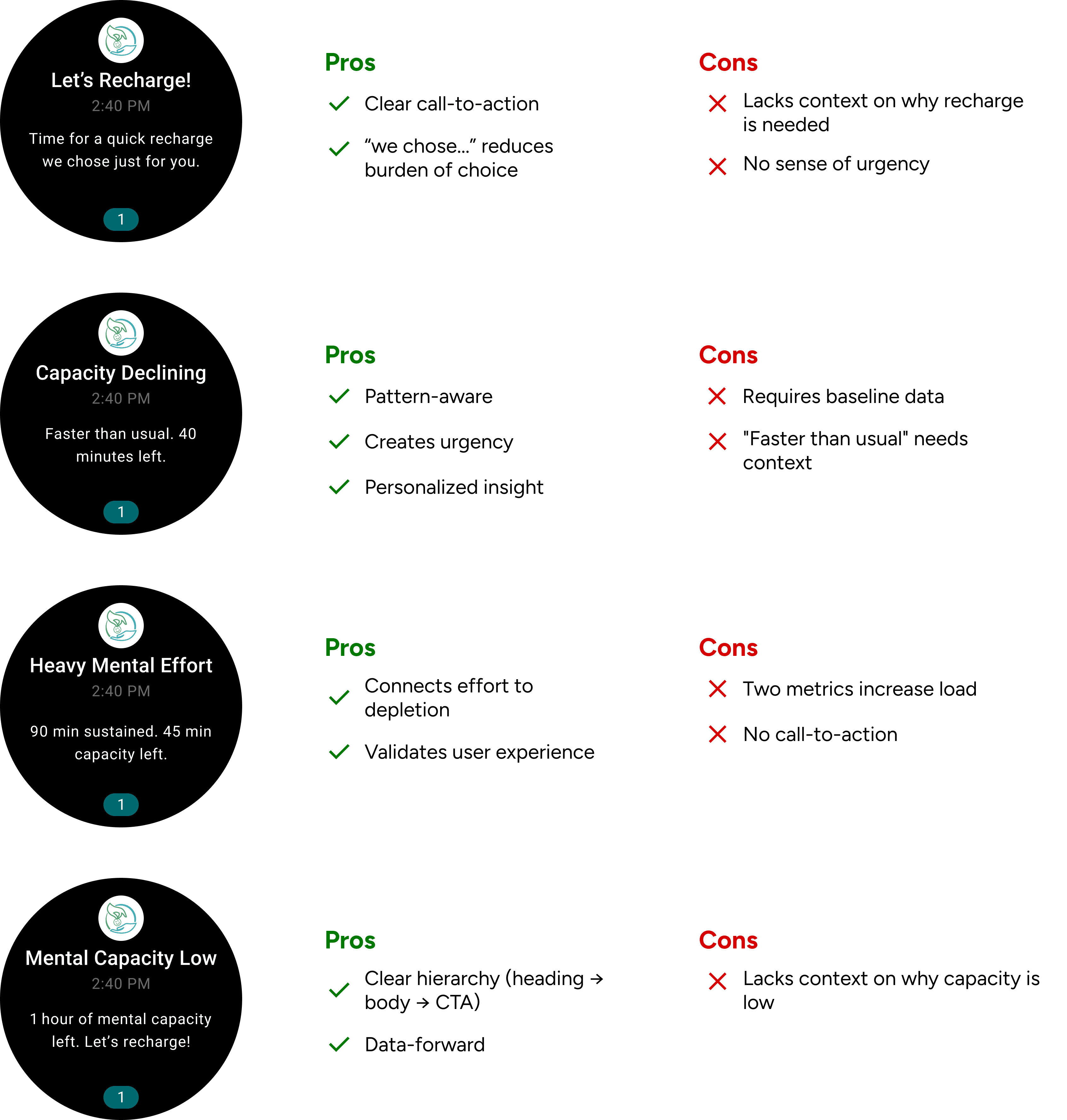 Wearables demand fast, low-effort interactions with messages understood in seconds. I developed multiple UX copy iterations to achieve this: